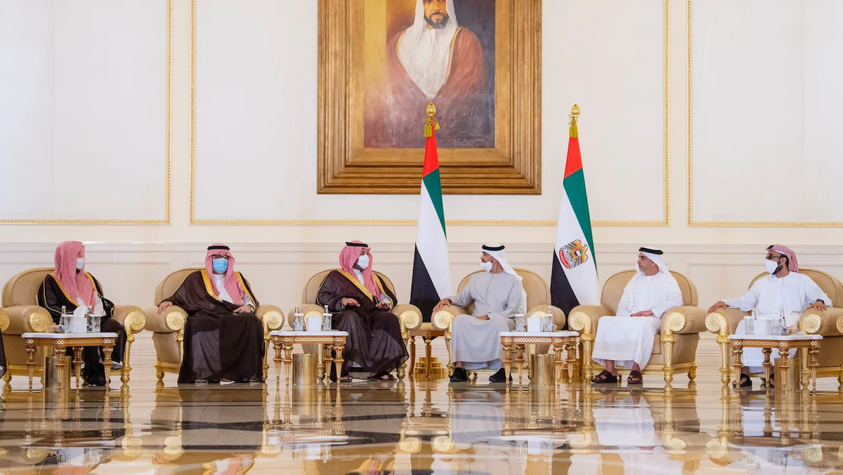 كما كان في استقبال ولي العهد السعودي الشيخ هزاع بن زايد نائب رئيس المجلس التنفيذي لأبوظبي، والشيخ نهيان بن زايد رئيس مجلس أمناء مؤسسة زايد بن سلطان للأعمال الخيرية والإنسانية، والفريق الشيخ سيف بن زايد نائب رئيس مجلس الوزراء وزير الداخلية، والشيخ طحنون بن زايد مستشار الأمن الوطني، والشيخ منصور بن زايد نائب رئيس مجلس الوزراء وزير شؤون الرئاسة، بحسب "واس".