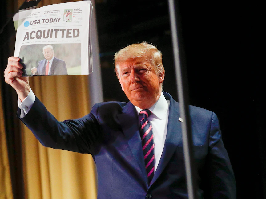 الرئيس الأميركي دونالد ترمب يحمل نسخة من الصفحة الأولى لصحيفة "يو إس إيه توداي" تظهر خبر تبرئته في محاكمة عزله الأولى في مجلس الشيوخ، 6 فبراير 2020 - REUTERS
