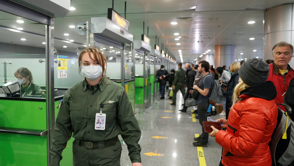 حرس الحدود الأوكراني في بوريسبيل الدولي القريب من كييف - 4 فبراير 2022 - REUTERS