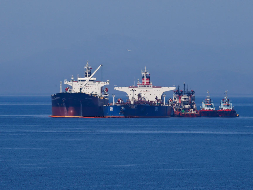ناقلة نفط تحمل علم ليبيريا تنقل حمولة الوقود الإيراني المصادرة من الناقلة الروسية التي احتجزتها اليونان في 19 أبريل تمهيداً لتسليم الشحنة للولايات المتحدة - جزيرة إيفيا (اليونان) - 29 مايو 2022 - REUTERS
