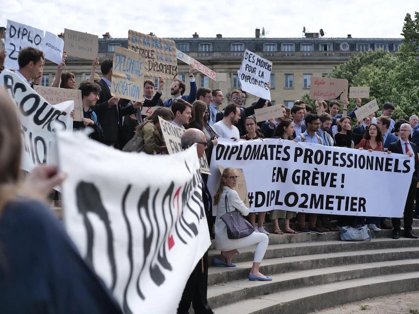 ويطالب الدبلوماسيون المضربون الرئيس الفرنسي إيمانويل ماكرون، بإلغاء خطة تستهدف دمج الدبلوماسيين المحترفين في هيئة أكبر تضمّ موظفي الخدمة المدنية، بدءاً من يناير المقبل، أو على الأقلّ إجراء حوار في هذا الصدد. وتفيد معلومات بأن الخطة، التي أعلنها ماكرون في مرسوم صدر في أبريل الماضي، ستمسّ حوالى 800 دبلوماسي.