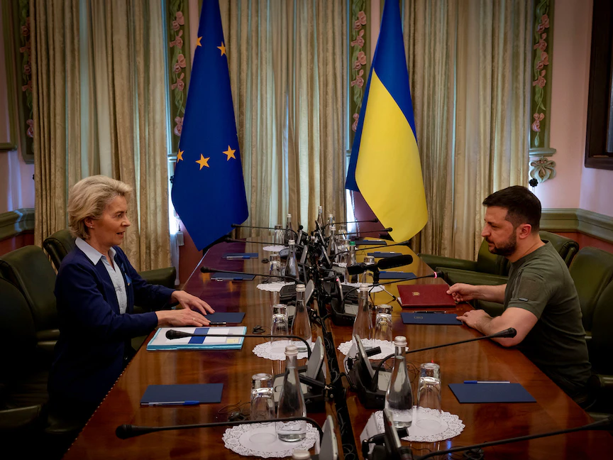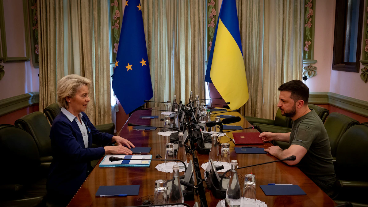 في محاولة لتعزيز وضعها أمام الغزو الروسي، تقدمت أوكرانيا إلى الاتحاد الأوروبي بطلب للانضمام والذي جاء مشفوعاً بتزكية نحو 8 دول أوروبية، إضافة إلى تجاوب رئيسة المفوضية أورسولا فون دير لاين.