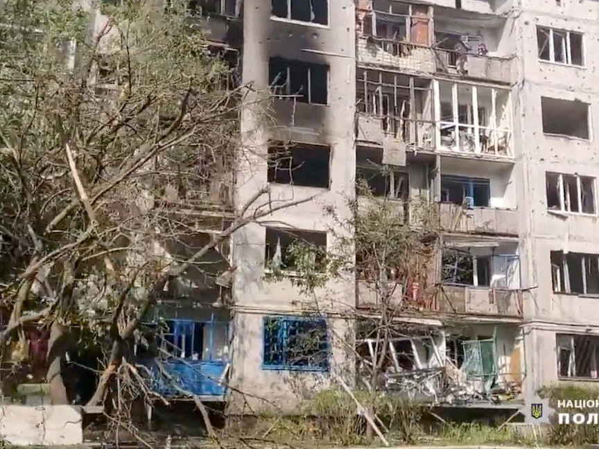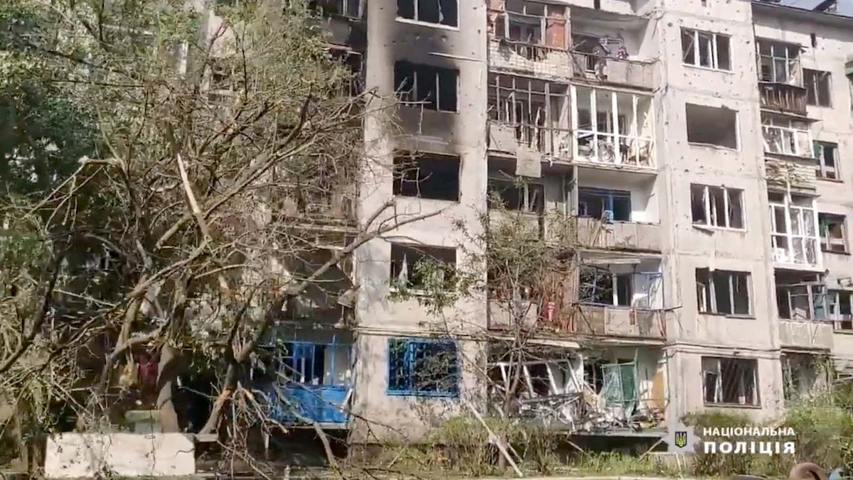 منظر عام للمباني المتضررة في أعقاب القصف بمنطقة دونيتسك الانفصالية. 13 يونيو 2022 - via REUTERS