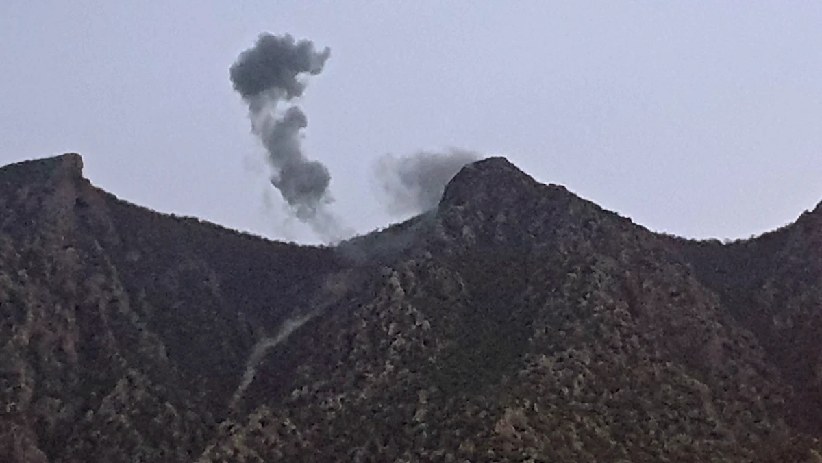 دخان يتصاعد من خلف جبال المتن في بلدة شيلادزه عقب هجوم تركي استهدف قوات حزب العمال الكردستاني شمالي العراق - 19 أبريل 2022 - AFP