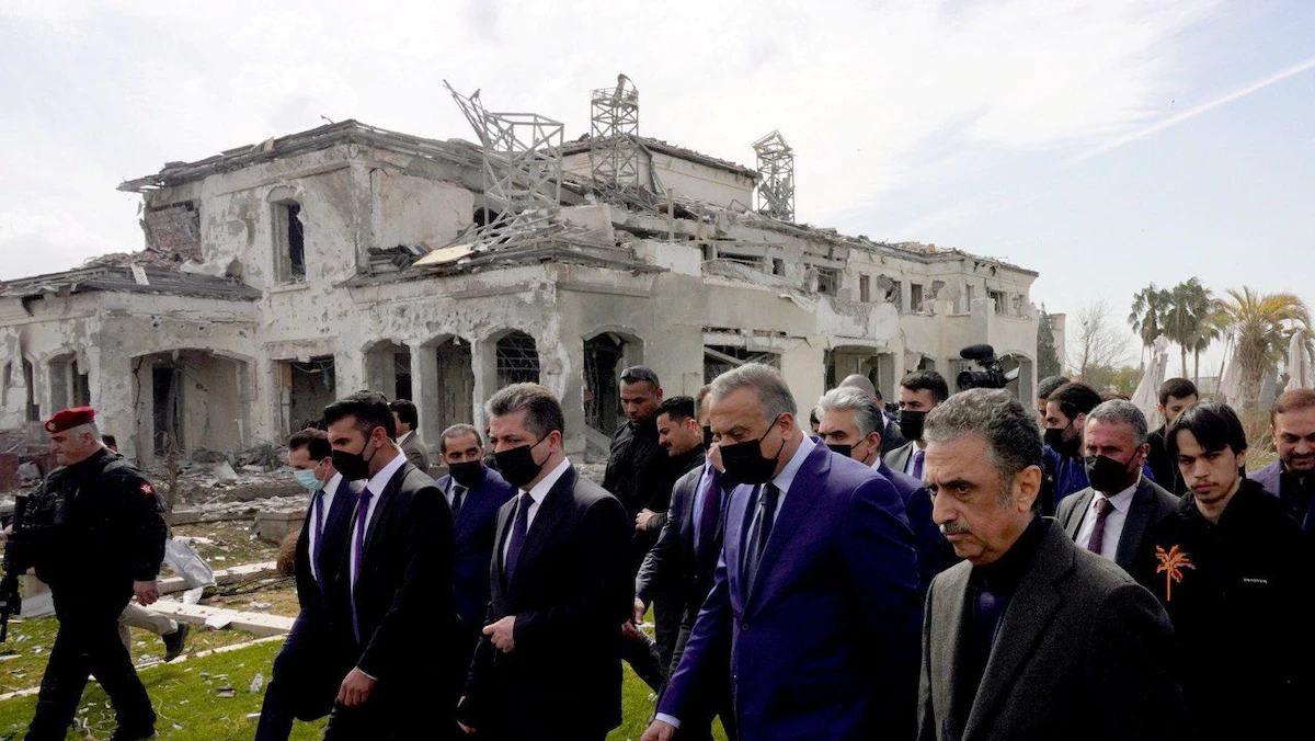 رئيس الوزراء العراقي مصطفى الكاظمي يرافقه رئيس حكومة لإقليم كردستان العراق مسرور بارزاني يتفقدان مبنى استهدفه القصف الإيراني في أربيل. 14 مارس 2022 - REUTERS