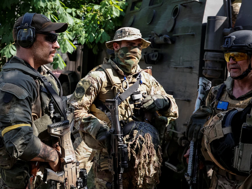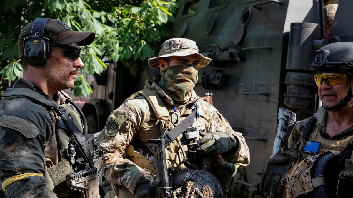 أفراد من وحدة المتطوعين الأجانب التي تقاتل في الجيش الأوكراني في سيفيرودونتسك بمنطقة لوغانسك شرق أوكرانيا - 2 يونيو 2022 - REUTERS