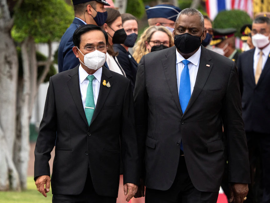 وزير الدفاع الأميركي لويد أوستن يلتقي رئيس الوزراء التايلاندي ووزير الدفاع برايوت تشان أوتشا (يسار) خلال زيارة رسمية لبانكوك - 13 يونيو 2022 - REUTERS