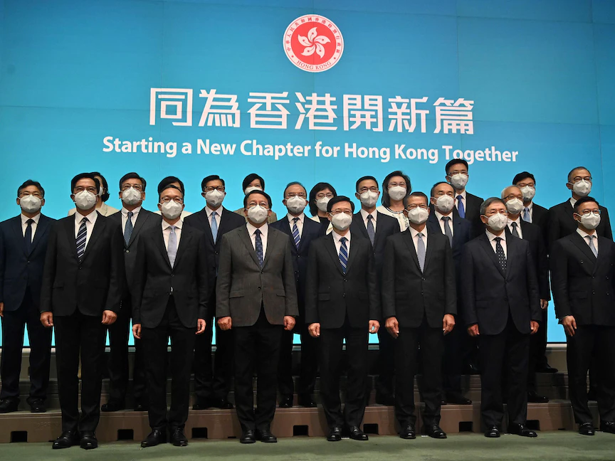 زعيم هونج كونج الجديد جون لي رفقة أعضاء حكومته المعينة حديثاً بمقر الحكومة في هونج كونج - 19 يونيو 2022 - AFP
