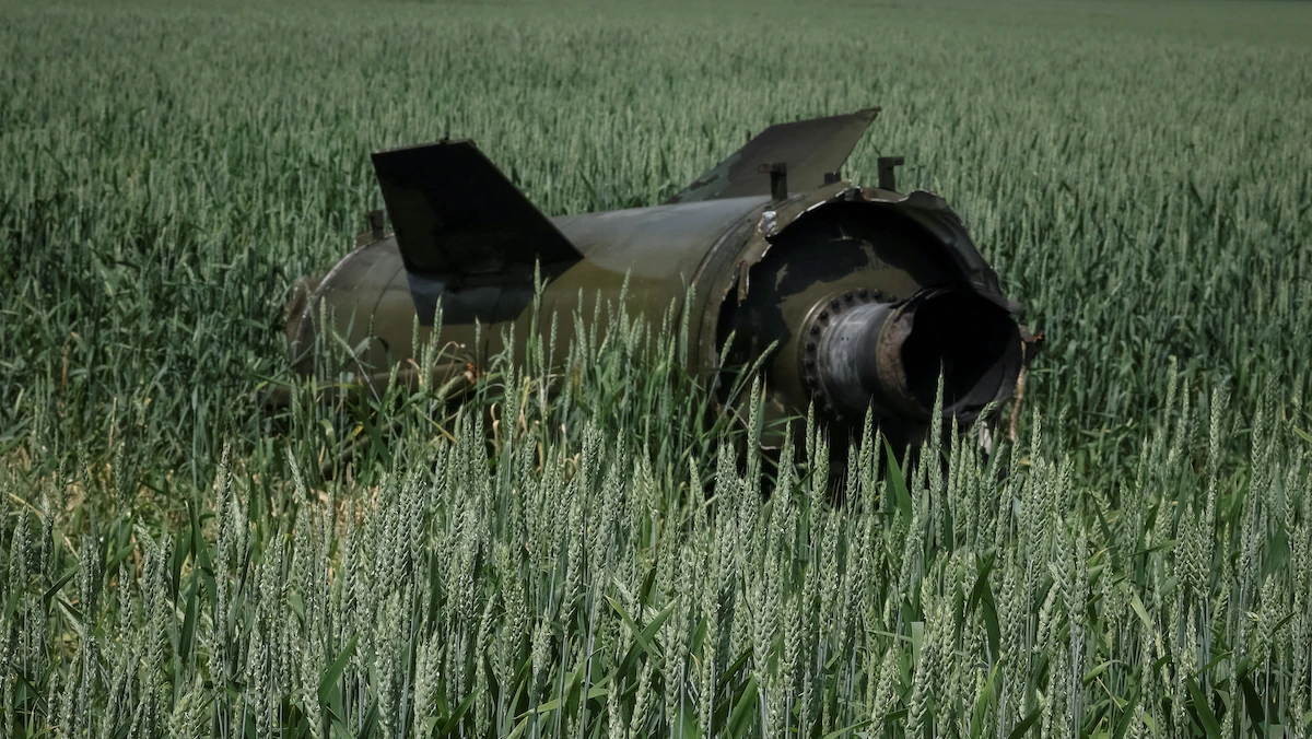 بقايا صاروخ باليستي روسي Tochka-U في حقل قمح بالقرب من بلدة سوليدار، في منطقة دونيتسك، أوكرانيا-8 يونيو 2022 - REUTERS