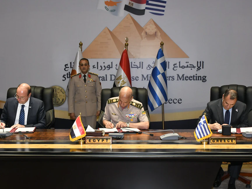 ووقع الوزراء الثلاث بياناً مشتركاً "في إطار مساعي القوات المسلحة المصرية والقبرصية واليونانية لدعم علاقات التعاون في المجالات الدفاعية والأمنية من أجل مواجهة التحديات والتهديدات ودعم سبل السلام والاستقرار في منطقة شرق البحر المتوسط".