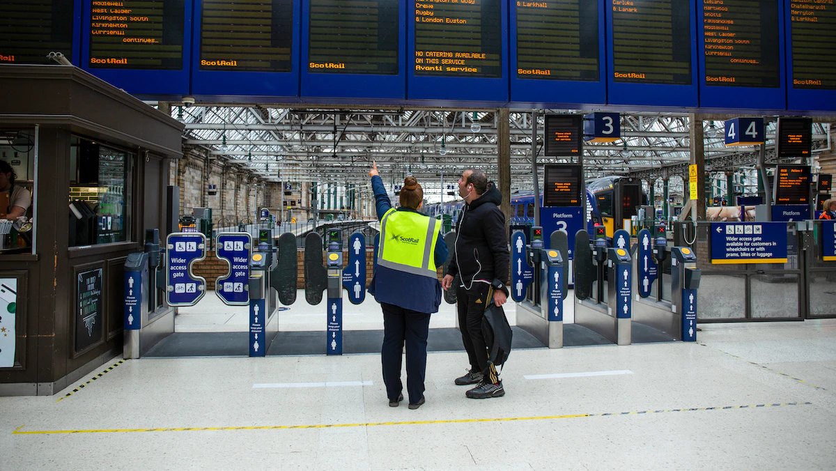 موظفة تساعد مسافراً بمحطة جلاسكو سنترال للقطارات وسط أكبر إضراب لعمال السكك الحديدية في بريطانيا منذ 30 عاماً  – 21 يونيو 2022 - Bloomberg