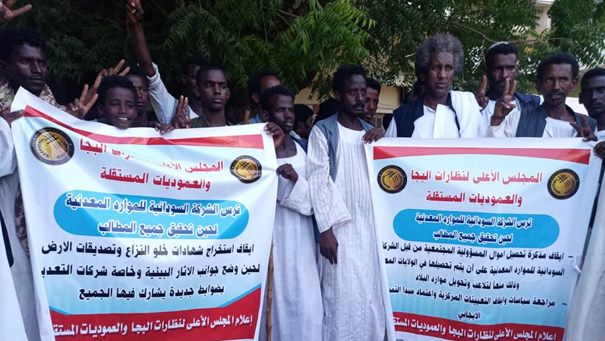 أنصار المجلس الأعلى لنظارات البجا والعموديات المستقلة بشرق السودان خلال إغلاق مباني الشركة السودانية للموارد المعدنية في بورتسودان - 5 يونيو 2022 - facebook/BejaSDN