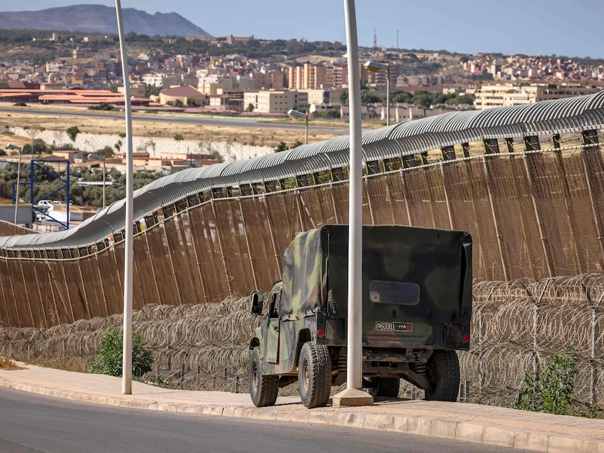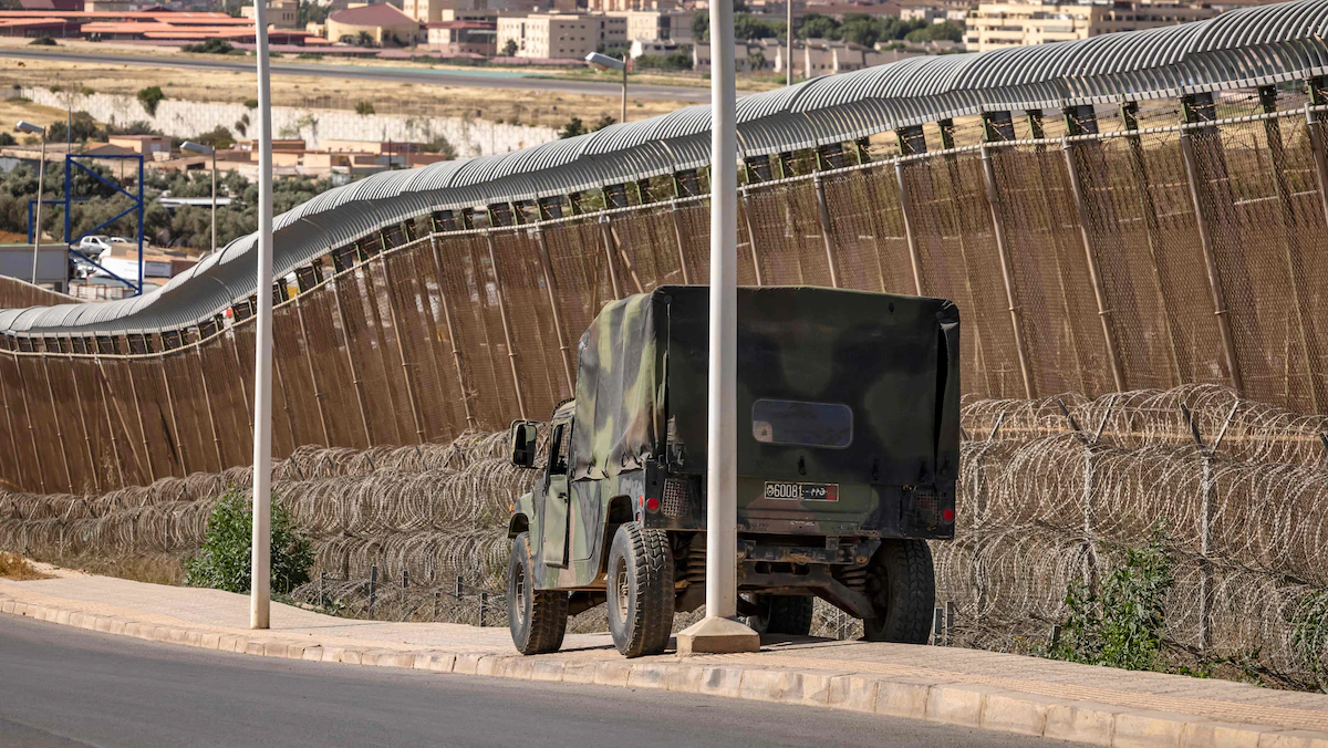عربة لقوات الأمن المغربية تقف عند السياج الحدودي الذي يفصل المغرب عن مليلية بالقرب من الناظور- 26 يونيو 2022. - AFP