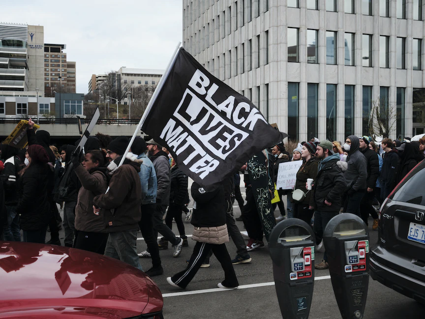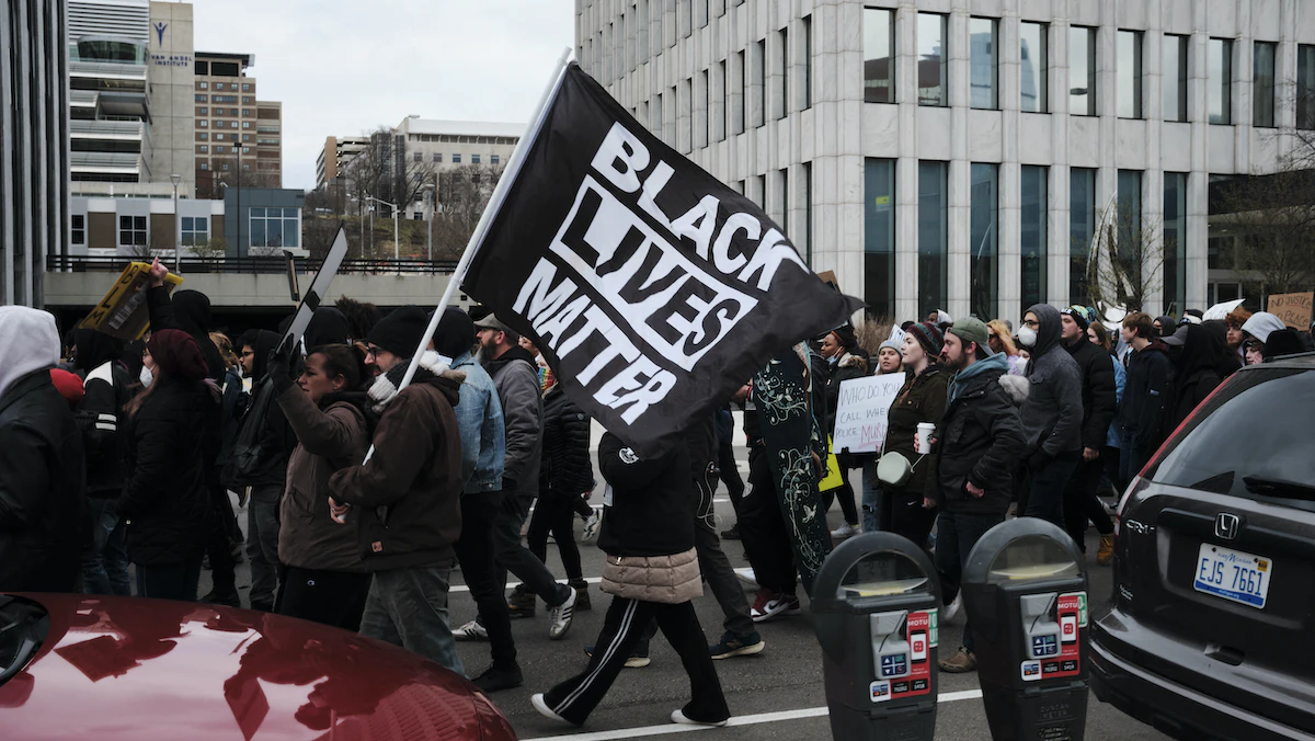 محتجون يحملون لافتة "حياة السود مهمة" في مدينة جراند رابيدز بولاية ميشيجان - 16 أبريل 2022. - AFP