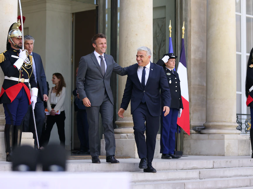 وصرّح مسؤول إسرائيلي كبير لعدد من الصحافيين يرافقون لبيد وبينهم صحافي لوكالة "فرانس برس" بأن "لبيد سيضغط على ماكرون لاتّخاذ موقف أكثر صرامة ومحدد زمنياً بشأن المفاوضات النووية الإيرانية"، وحذّر من أن جماعة حزب الله المدعومة من طهران "تلعب بالنار".