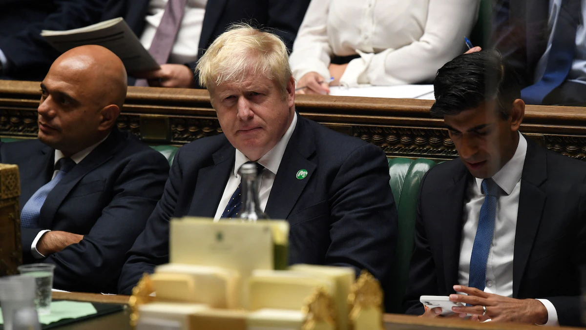 رئيس الوزراء البريطاني بوريس جونسون يجلس في مجلس العموم وإلى يساره وزير المال المستقيل ريشي سوناك وعن يمينه وزير الصحة المستقيل ساجد جاويد في جلسة سابقة بالبرلمان - 7 سبتمبر 2021 - AFP