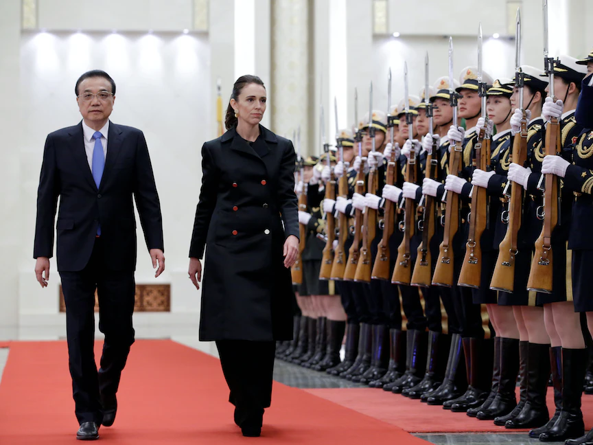 رئيسة الوزراء النيوزيلندية جاسيندا أرديرن ونظيرها الصيني لي كيكيانج يستعرضان حرس الشرف في بكين - 1 أبريل 2019 - REUTERS