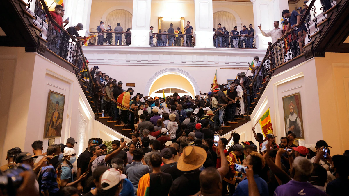 جاء ذلك فيما واصل محتجون الأحد، التجوّل في قصر الرئاسة، الذي دُمّرت أجزاء منه بعدما اقتحمه السبت مئات المتظاهرين، وأضرموا النار فيه إثر فرار راجاباكسا.