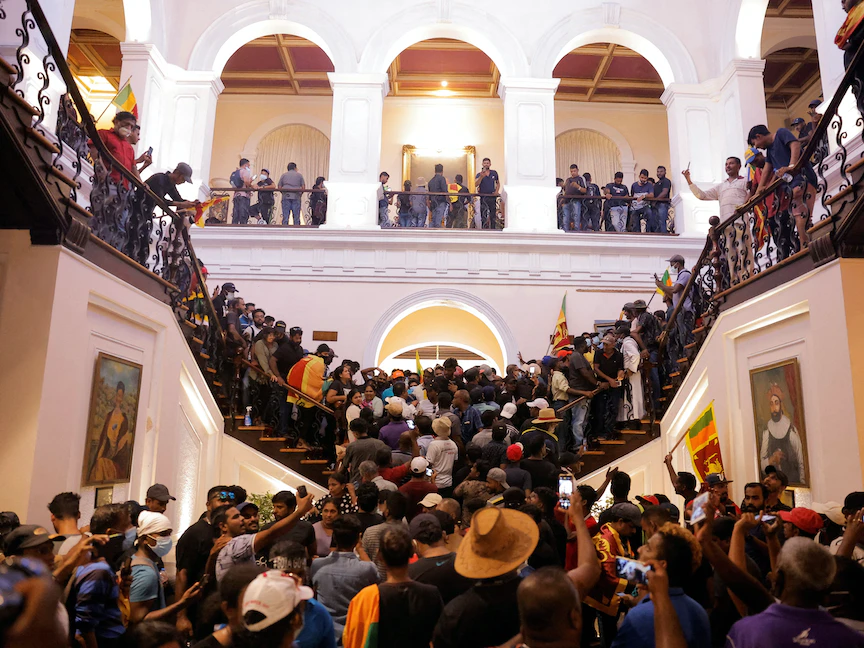 محتجون داخل قصر الرئاسة في كولومبو بعد فرار الرئيس جوتابايا راجاباكسا - 9 يوليو 2022 - REUTERS