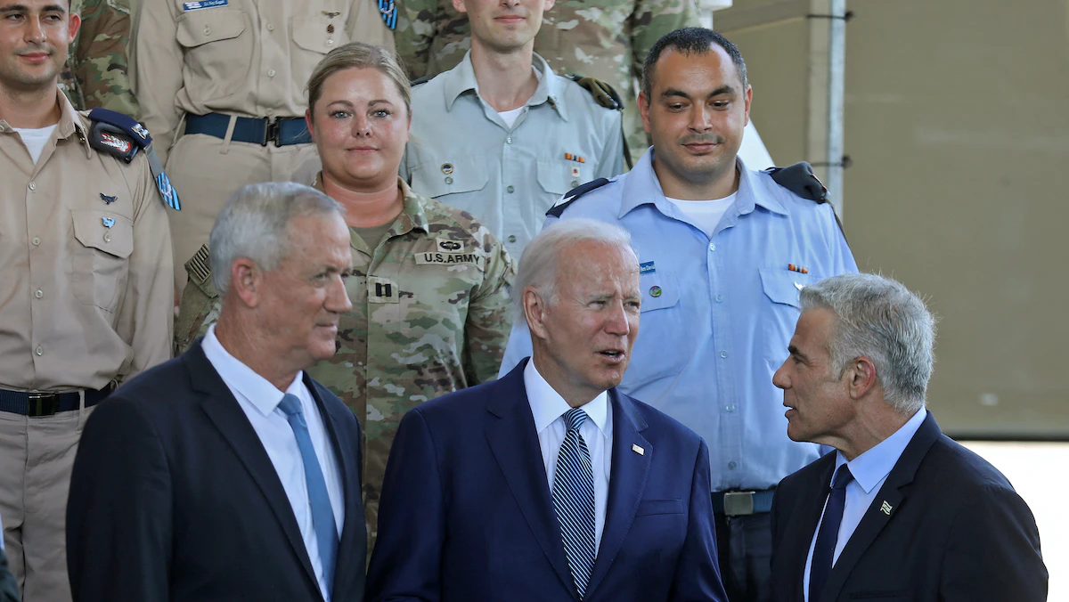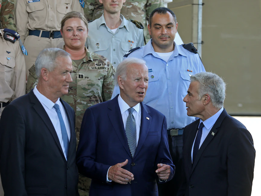 الرئيس الأميركي جو بايدن بين رئيس الوزراء الإسرائيلي يائير لبيد (يمين) ووزير الدفاع الإسرائيلي بيني جانتس في إسرائيل- 13 يوليو 2022 - REUTERS
