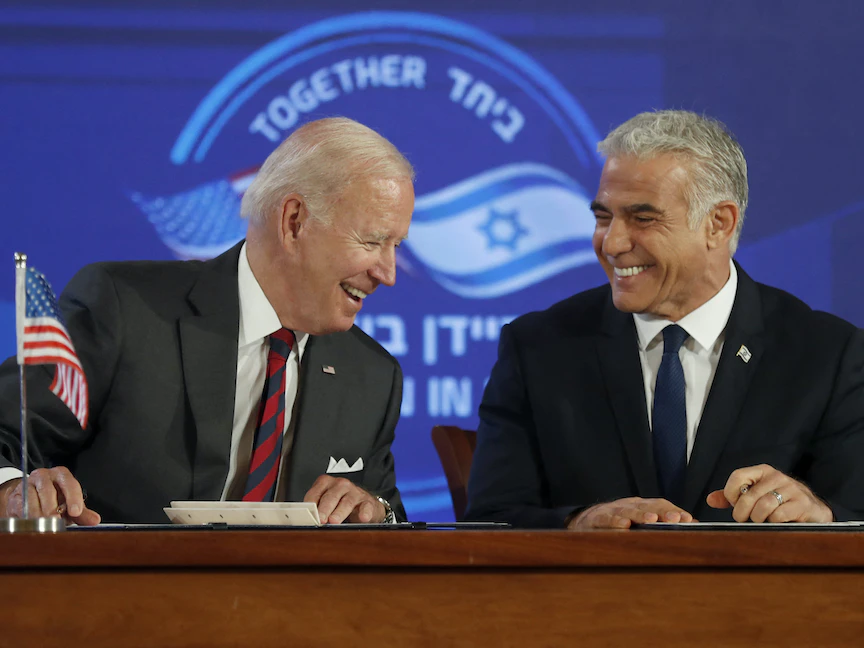 وقع الرئيس الأميركي جو بايدن ورئيس الوزراء الإسرائيلي يائير لبيد، الخميس، على إعلان الشراكة الاستراتيجية، الذي يهدف إلى التأكيد على الروابط بين البلدين وتوسيع علاقاتهما الأمنية طويلة الأمد ومواجهة التحديات، بمقدمتها إيران.