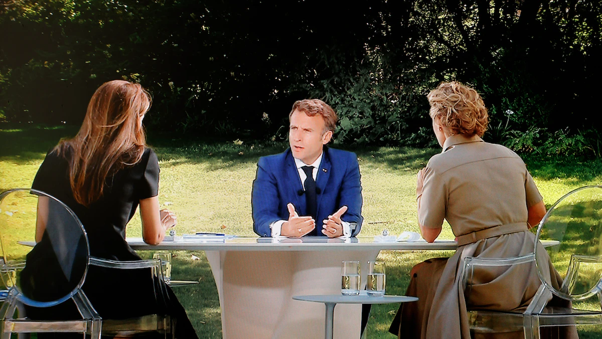الرئيس الفرنسي إيمانويل ماكرون خلال مقابلة تلفزيونية في قصر الإليزيه بالعاصمة باريس- 14 يوليو 2022 - AFP