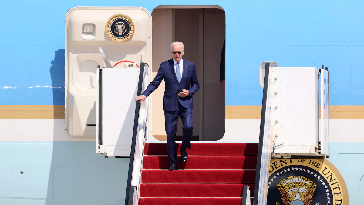 الرئيس الأميركي جو بايدن على سلم الطائرة في مطار بن جوريون في تل أبيب إسرائيل - 13 يوليو 2022 - AFP