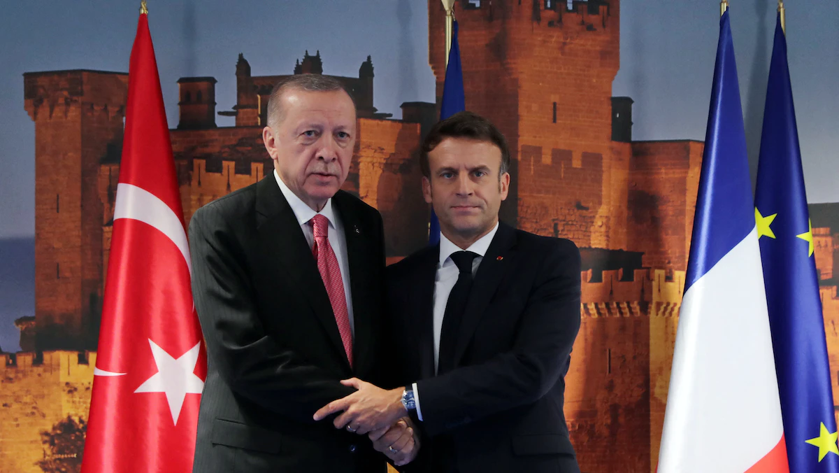 مصافحة بين الرئيس الفرنسي إيمانويل ماكرون ونظيره التركي رجب طيب أردوغان على هامش قمة حلف شمال الأطلسي "الناتو" في مدريد - 29 يونيو 2022. - REUTERS