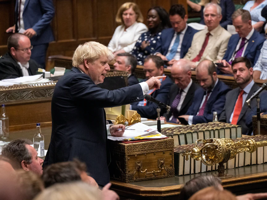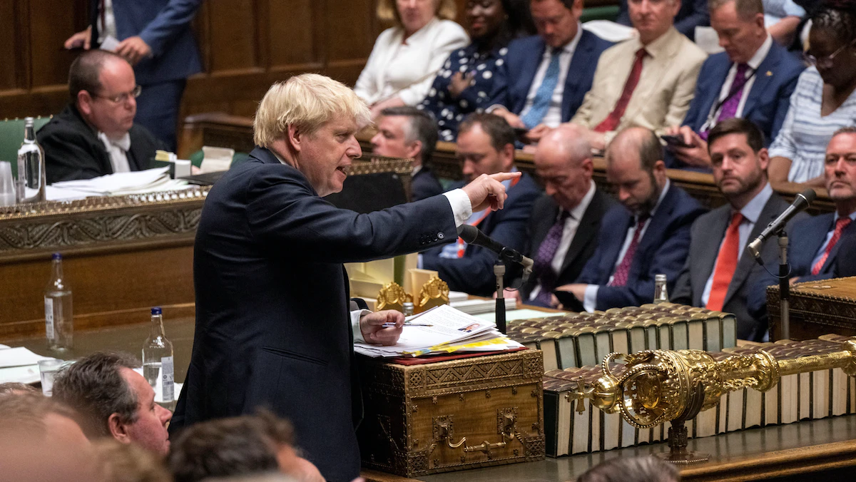 رئيس الوزراء البريطاني بوريس جونسون خلال المناظرة الأسبوعية في مجلس العموم بالعاصمة لندن - 13 يوليو 2022 - REUTERS