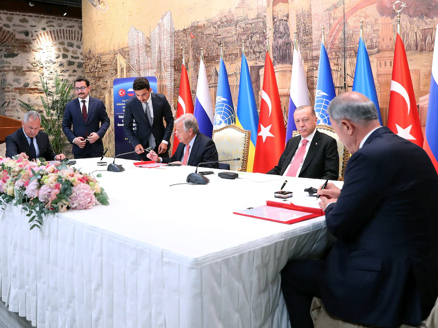 وقعت روسيا وأوكرانيا وتركيا العضو في حلف شمال الأطلسي والأمم المتحدة، اتفاقاً مهماً الجمعة، لفك الحصار المفروض على صادرات الحبوب والأسمدة الأوكرانية من موانئ البحر الأسود، بهدف المساعدة في تخفيف حدة أزمة الأغذية العالمية المتنامية.
