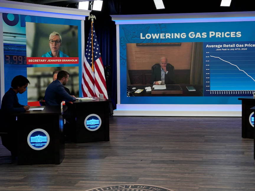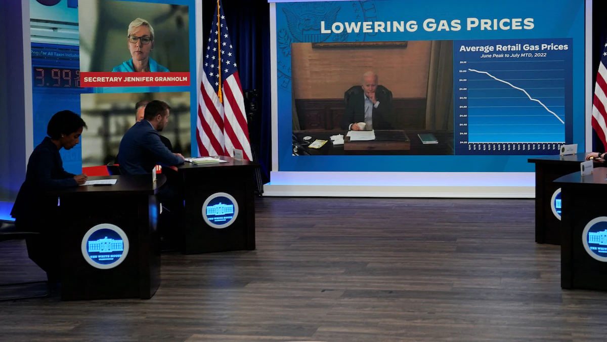 الرئيس الأميركي جو بايدن خلال اجتماع "عبر الفيديو" مع فريقه الاقتصادي بالبيت الأبيض بعد إعلان إصابته بفيروس كورونا - 22 يوليو 2022 - REUTERS
