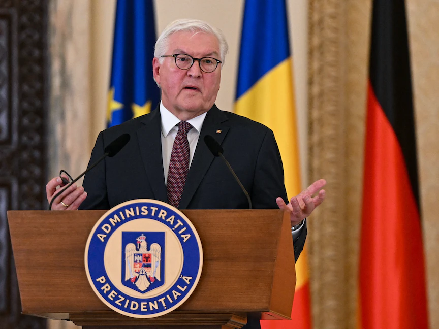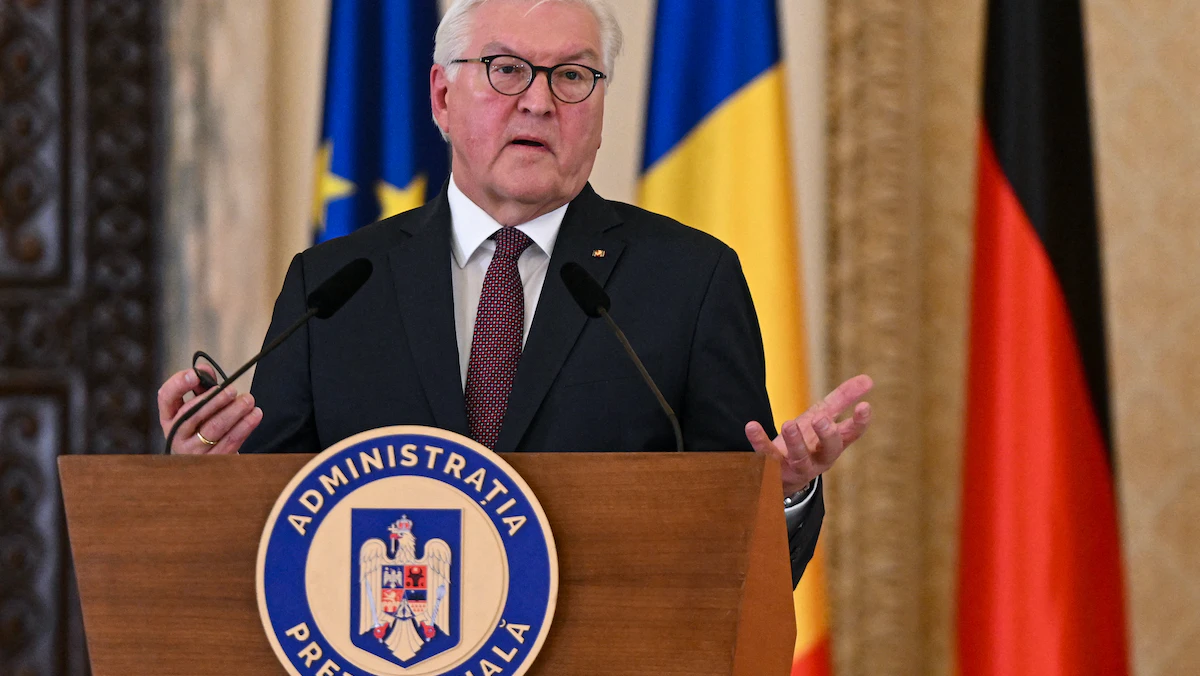 الرئيس الألماني فرانك فالتر شتاينماير خلال مؤتمر صحافي في بوخارست. 4 مايو 2022. - AFP
