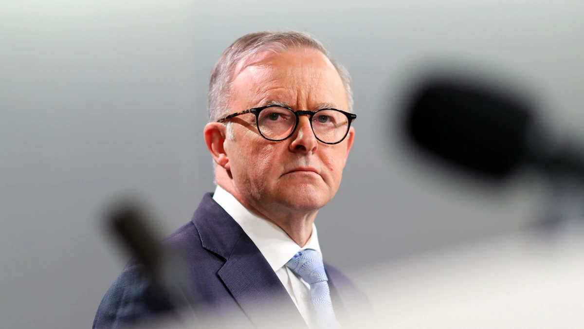 رئيس الوزراء الأسترالي أنتوني ألبانيز خلال مؤتمر صحافي مع نظيرته النيوزيلندية جاسيندا أرديرن في سيدني - 10 يونيو 2022 - Bloomberg