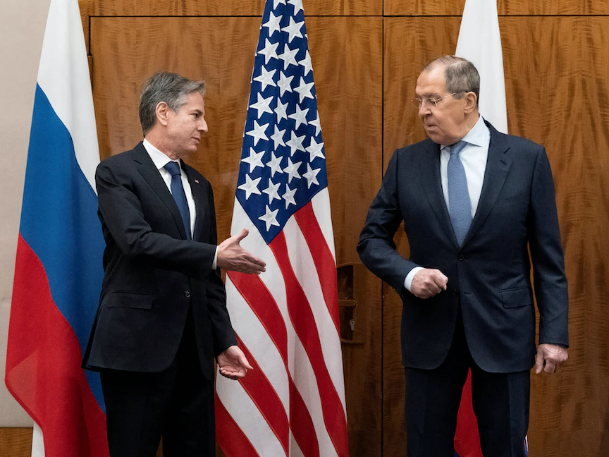 وزير الخارجية الأميركي أنتوني بلينكن مع نظيره الروسي سيرجي لافروف خلال لقاء سابق في جنيف - 21 يناير 2022 - REUTERS