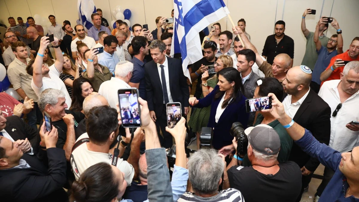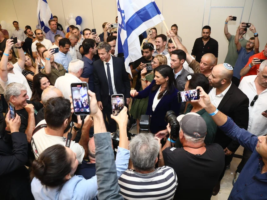 رئيسة حزب "يمينا" أيليت شاكيد ورئيس حزب "ديريخ إيرتس" يوعاز هندل يتلقيان التهاني بعد التوقيع على اتفاق لتوحيد حزبيهما تحت اسم "الروح الصهيونية" في إسرائيل - 27 يوليو 2022 - Twitter/YoazHendel1