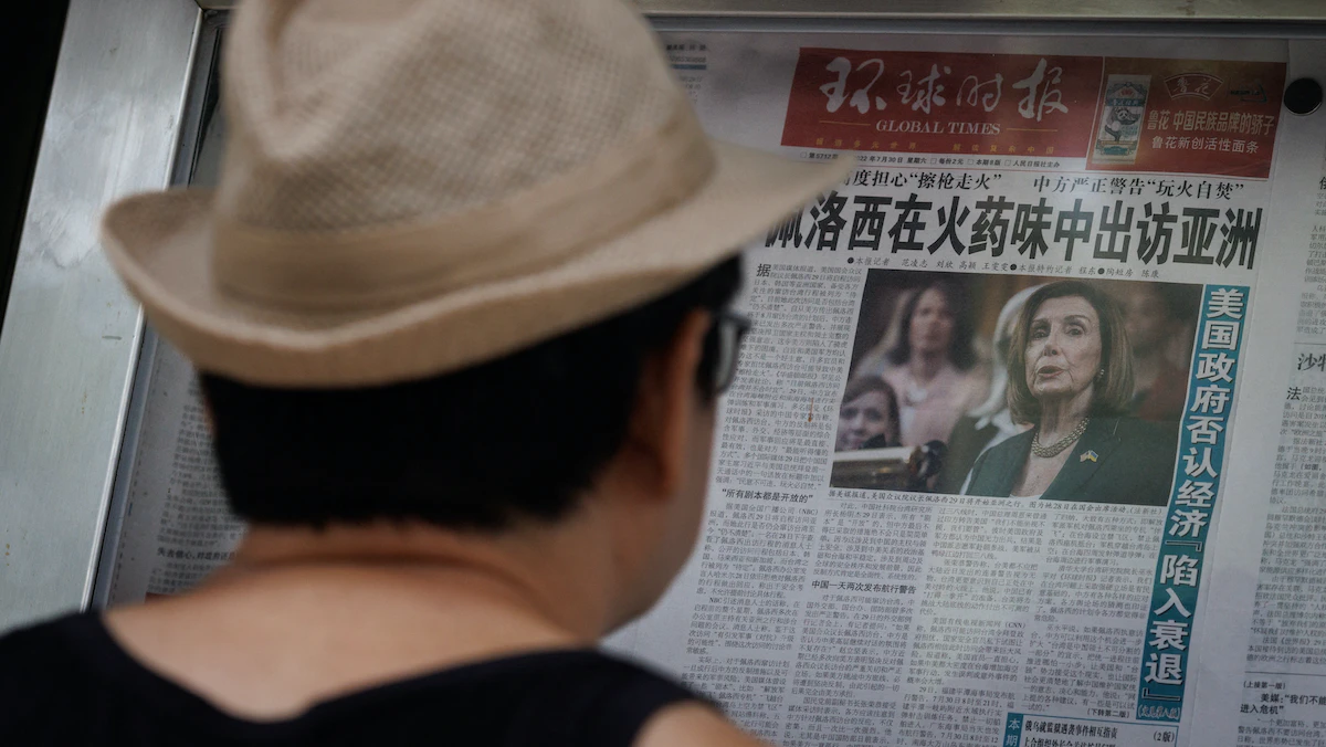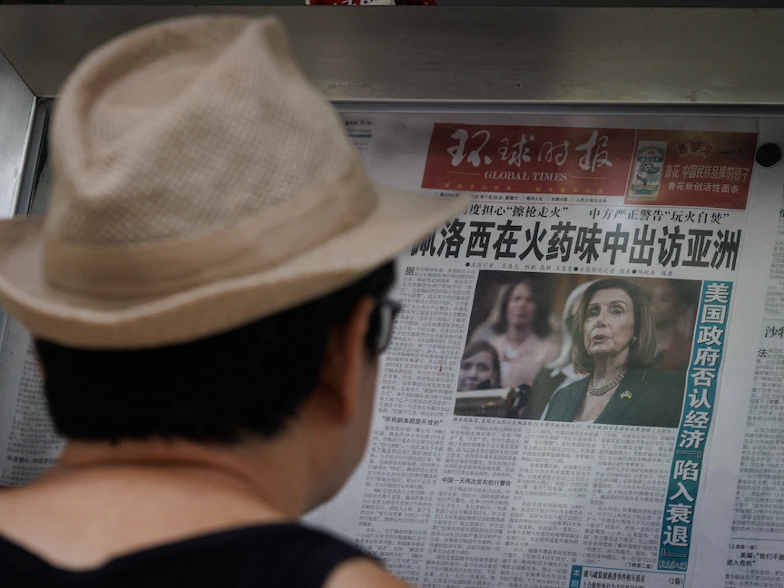 رجل يقرأ خبراً في صحيفة صينية عن جولة رئيسة مجلس النواب الأميركي نانسي بيلوسي في آسيا وزيارتها المحتملة إلى تايوان. 1 أغسطس 2022 - REUTERS
