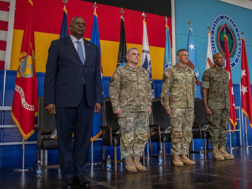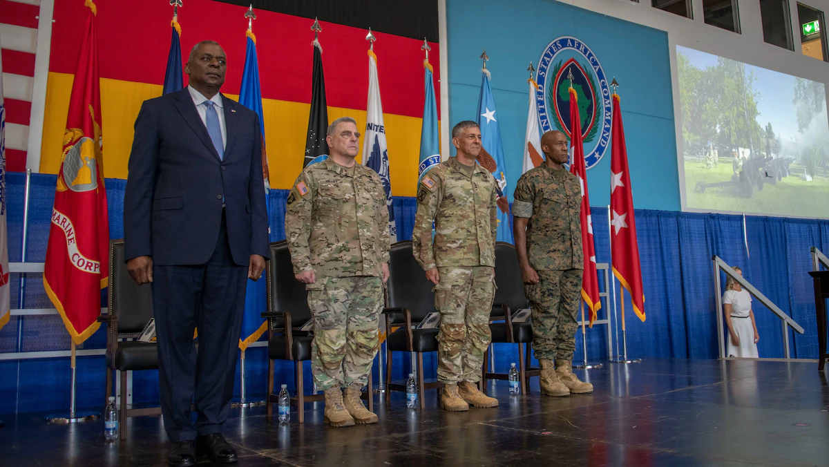 وزير الدفاع الأمريكي لويد أوستن بجانب مسؤولين عسكريين في حفل تنصيب قائد جديد للقيادة العسكرية الأميركية في إفريقيا (أفريكوم) - 9 أغسطس 2022 - twitter.com/USAfricaCommand