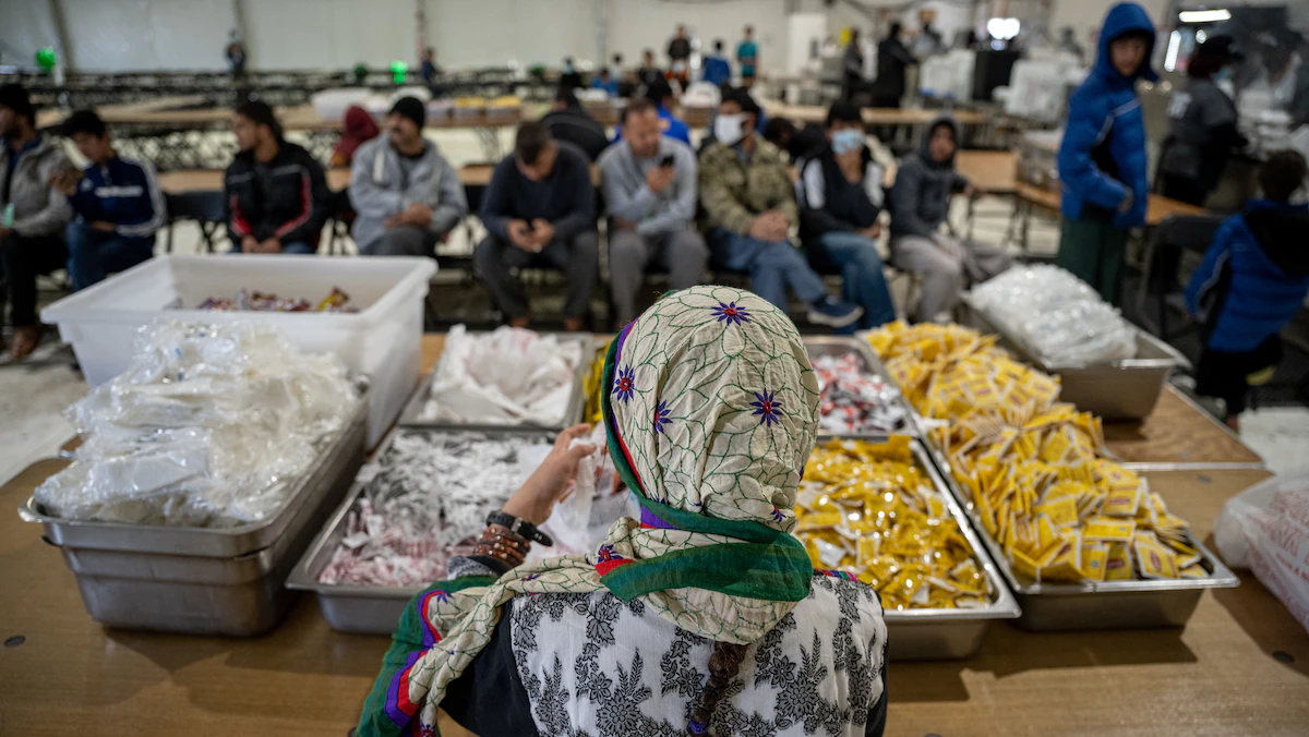 أفغان ينتظرون الطعام في مأوى "فورت بيكيت" بولاية فيرجينيا الأميركية للاجئين - AFP
