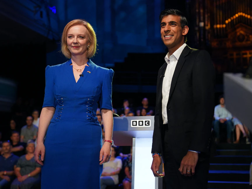 المرشحان لزعامة حزب المحافظين في بريطانيا وقيادة الحكومة المقبلة وزير المالية السابق ريشي سوناك ووزيرة الخارجية ليز تروس خلال مناظرة في ستوك أون ترينت وسط إنجلترا - 25 يوليو 2022 - AFP
