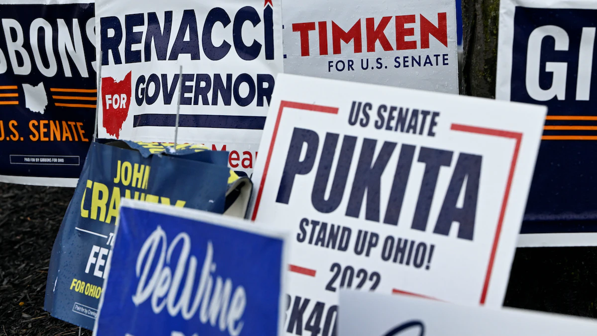 لافتات لمرشحين في انتخابات التجديد النصفي للكونجرس بولاية أوهايو الأميركية - 3 مايو 2022 - REUTERS