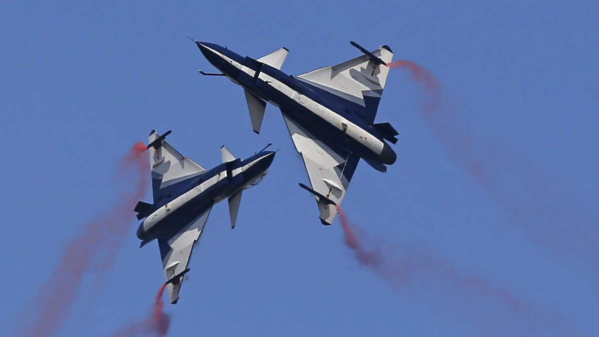 مقاتلتان صينيتان من طراز "جاي-10" تنفذان عرضاً جوياً في قاعدة كورات الجوية الملكية بتايلاند - 24 نوفمبر 2015 - REUTERS