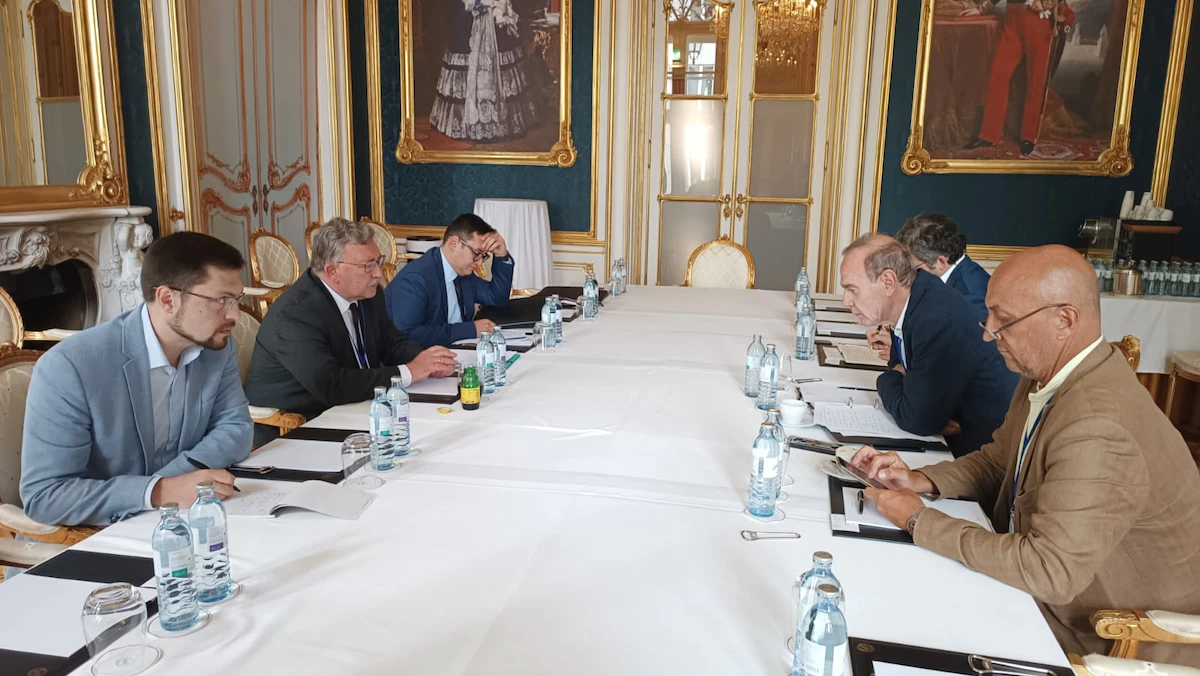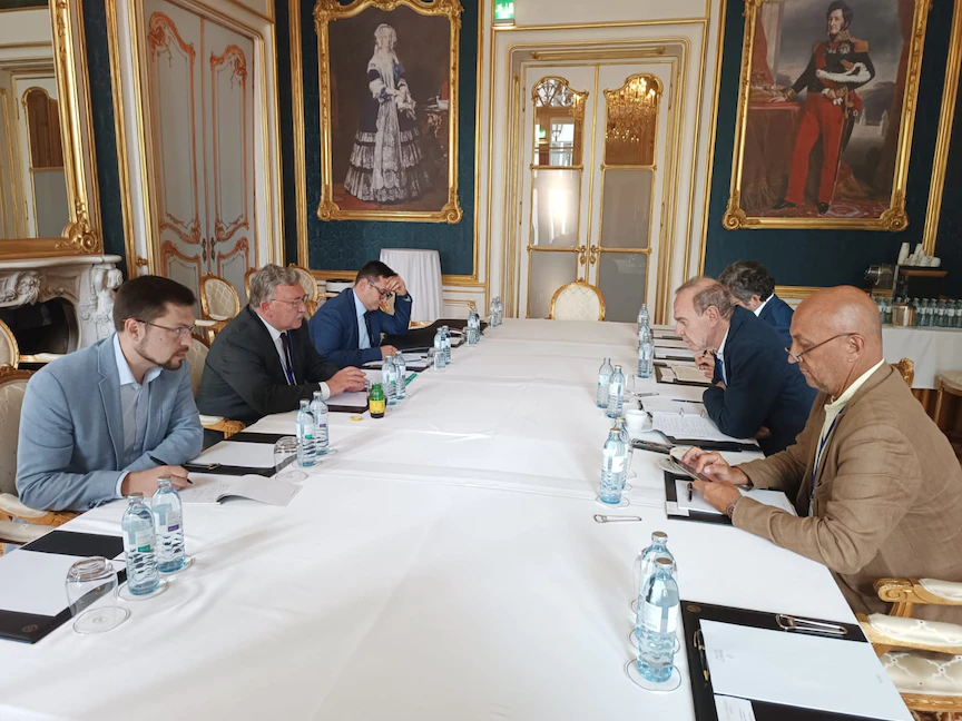 مندوب روسيا لدى المنظمات الدولية في فيينا ميخائيل أوليانوف خلال لقائه المنسق الأوروبي إنريكي مورا في فيينا- 7 أغسطس 2022 - Twitter/Amb_Ulyanov