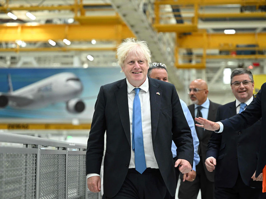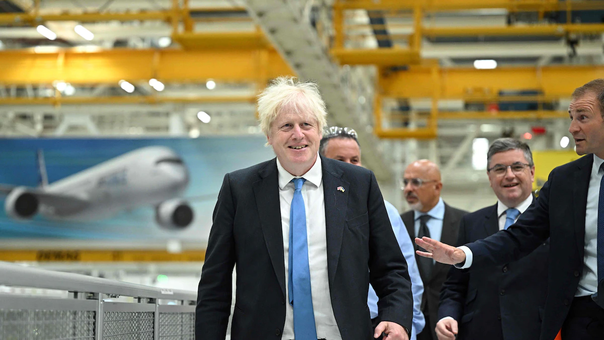 رئيس الوزراء البريطاني المستقيل بوريس جونسون خلال جولة في مصنع إيرباص في مدينة بروتون بمقاطعة تشيستر شمال غرب إنجلترا. 12 أغسطس 2022 - AFP