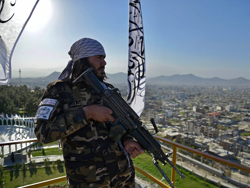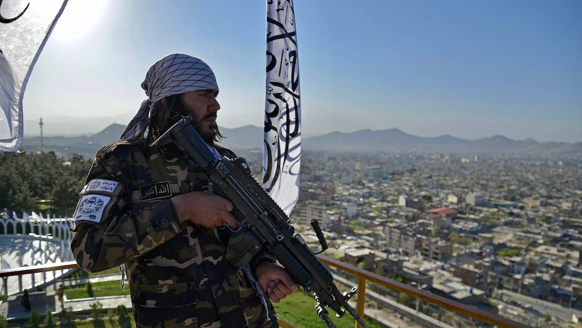 مسلح من طالبان بالقرب من علم الحركة في إحدى الفعاليات بالعاصمة الأفغانية كابول. 31 مارس 2022 - AFP