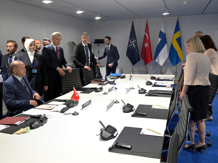 الرئيس التركي رجب طيب أردوغان قال مؤخراً إن بلاده لا تزال مُتمسكة بموقفها "الصريح والحازم" بشأن طلب السويد وفنلندا الانضمام إلى حلف شمال الأطلسي "الناتو"، مبيناً أن بلاده لن توافق على عضوية البلدين في الحلف قبل إيفائهما بتعهداتهما المقدمة لأنقرة والمسجلة في المذكرة الثلاثية.