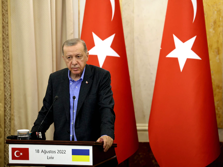 الرئيس التركي رجب طيب أردوغان خلال مؤتمر صحافي عقب لقائه مع نظيره الأوكراني فولوديمير زيلينكسي والأمين العام للأمم المتحدة أنطونيو جوتيريش في لفيف بأوكرانيا- 18 أغسطس 2022 - AFP