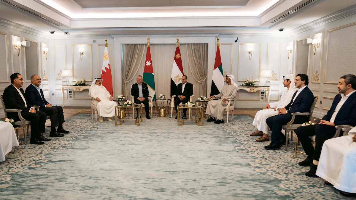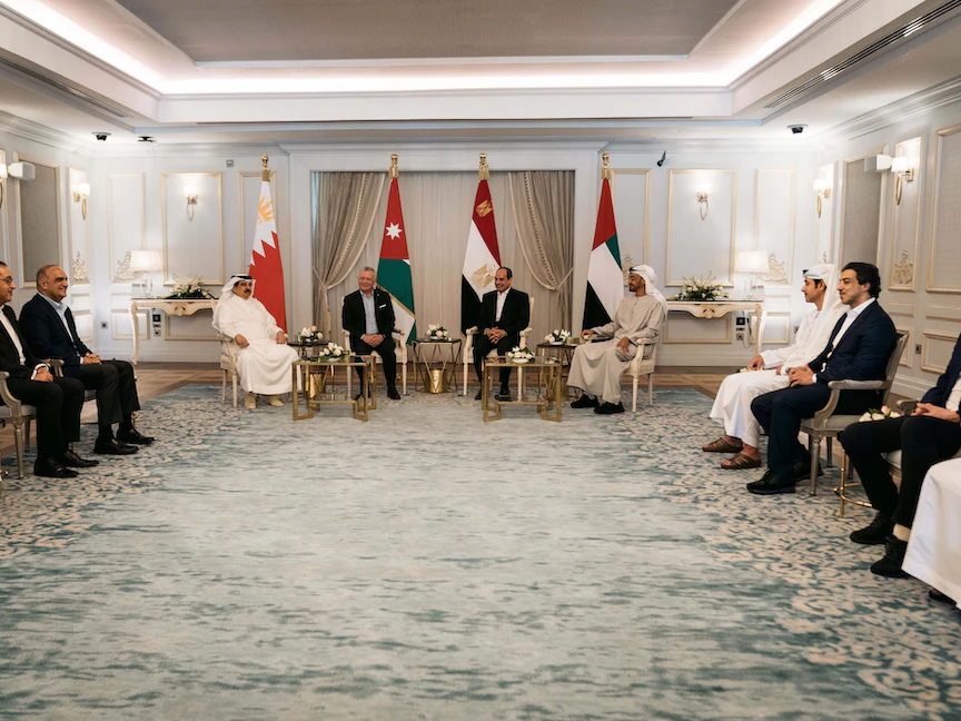 وقالت وكالة أنباء الشرق الأوسط "أ ش أ"، إن الرئيس المصري عبد الفتاح السيسي بحث مع رئيس دولة الإمارات الشيخ محمد بن زايد وملك الأردن عبد الله الثاني وملك البحرين حمد بن عيسى آل خليفة في قصر الرئاسة بمدينة العلمين الجديدة عدداً من القضايا الإقليمية والدولية.