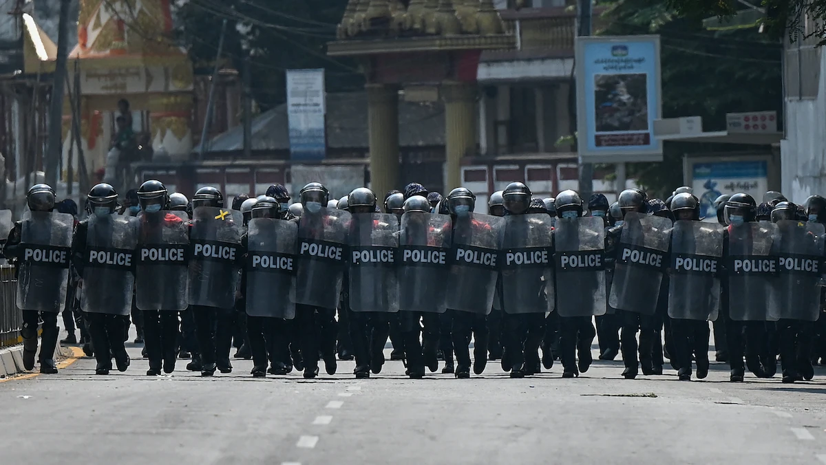 الشرطة تتقدم نحو المتظاهرين الذين تظاهروا ضد الانقلاب العسكري في يانغون - 22 فبراير 2021 - AFP