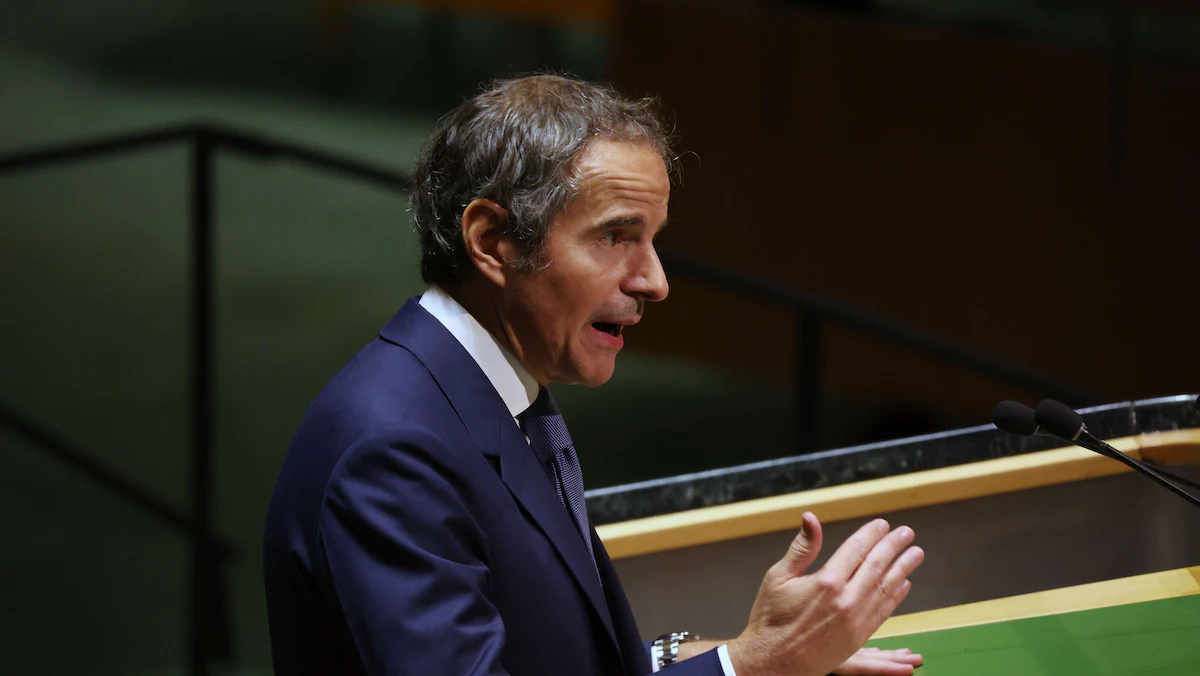 المدير العام للوكالة الدولية للطاقة الذرية رافائيل جروسي يتحدث خلال المؤتمر  الاستعراضي العاشر لمعاهدة عدم الانتشار النووي بمقر الأمم المتحدة في نيويورك- 1 أغسطس 2022. - AFP
