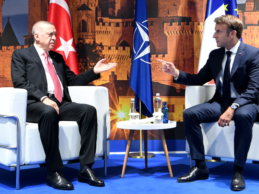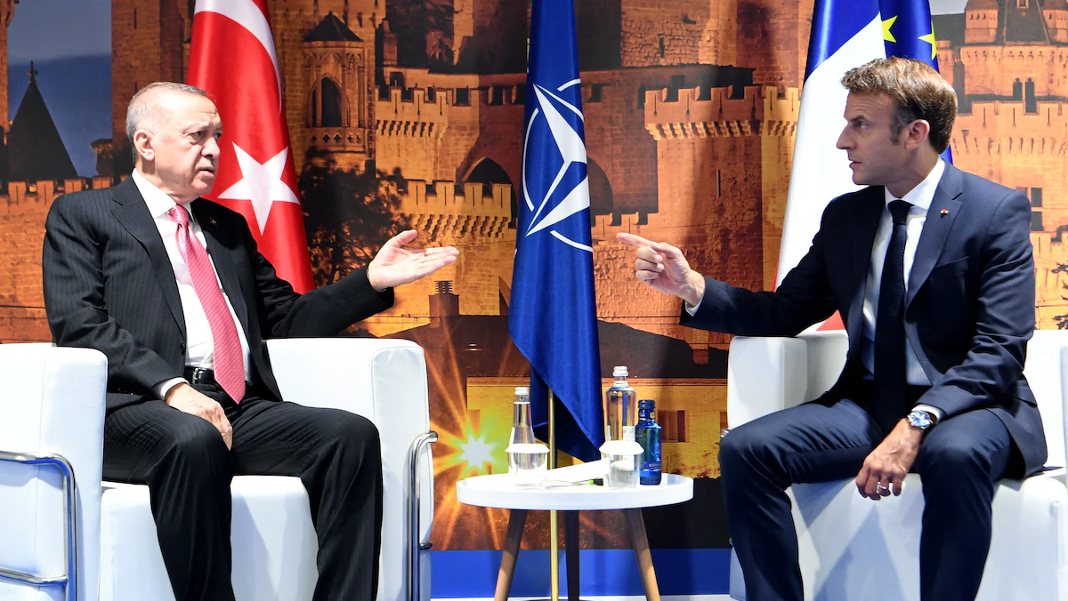 الرئيس الفرنسي إيمانويل ماكرون (يمين) ونظيره التركي رجب طيب أردوغان يتحدثان خلال اجتماع ثنائي كجزء من قمة حلف شمال الأطلسي (ناتو) في مدريد إسبانيا - 29 يونيو 2022 - AFP